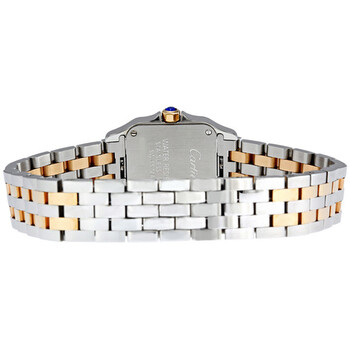 Stainless steel case with a two-tone (silver and gold-tone)stainless steel link bracelet. Fixed silver-tone bezel. Pink mother of pearl dial with blue steel hands and Roman numeral hour markers. Minute markers around the inner ring. Dial Type: Analog. Quartz movement. Scratch resistant sapphire crystal. Solid case back. Case dimensions: 19 mm x 20 mm. Case thickness: 5 mm. Hidden deployment clasp. Water resistant at 30 meters/ 100 feet. Functions: hours, minutes. Dress watch style. Cartier Santos Demoiselle Pink Mother of Pearl Dial Two Tone Steel Ladies Watch W25074Y9.