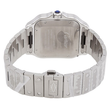 Silver-tone stainless steel case and bracelet. Fixed silver-tone stainless steel bezel. Grey dial with silver-tone hands and Roman numeral hour markers. Dial Type: Analog. Luminescent hands. Date display at the 3 o'clock position. Automatic movement with a 48-hour power reserve. Scratch resistant sapphire crystal. Square case shape, case size: 40.2 mm, case thickness: 10.1 mm. Water resistant at 100 meters / 330 feet. Functions: date, second time zone, hour, minute, second. Santos De Cartier Series. Dress watch style. Watch label: Swiss Made. Cartier Santos de Cartier Automatic Grey Dial Men's Watch WSSA0076.