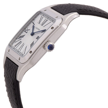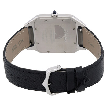 Silver-tone stainless steel case with a black leather strap. Fixed stainless steel bezel. Silver dial with blue hands and Roman numeral hour markers. Dial Type: 430 mc. Cartier Calibre 430 MC Hand Wind movement, based upon Piaget 430P, containing 18 Jewels, bitting at 21600 vph, and has a power reserve of approximately 40 hours. Scratch resistant sapphire crystal. Solid case back. Square case shape, case size: 46.6 mm x 33.9 mm, case thickness: 7.5. Deployment clasp. Water resistant at 30 meters / 100 feet. Functions: hour, minute. Santos Series. Luxury watch style. Watch label: Swiss Made. Cartier Santos Dumont XL Model Hand Wind Silver Dial Men's Watch WSSA0044.