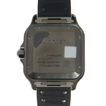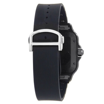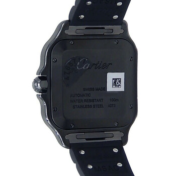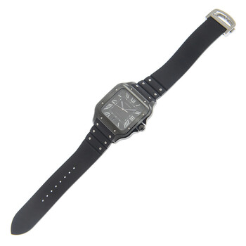 Black ADLC stainless steel case with a black rubber strap. Fixed black ADLC bezel. Black dial with luminous black hands and Roman numeral hour markers. Minute markers around an inner ring. Dial Type: Analog. Luminescent hands. Date display at the 6 o'clock position. Automatic movement. Scratch resistant sapphire crystal. Solid case back. Square case shape. Case size: 40 mm. Case thickness: 9.38 mm. Deployment with push button release clasp. Water resistant at 100 meters / 330 feet. Functions: date, hour, minute, second. Santos Series. Casual watch style. Watch label: Swiss Made. Cartier Santos Automatic Black Dial Black Rubber Men's Watch WSSA0039.