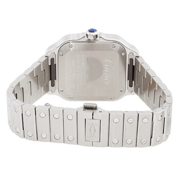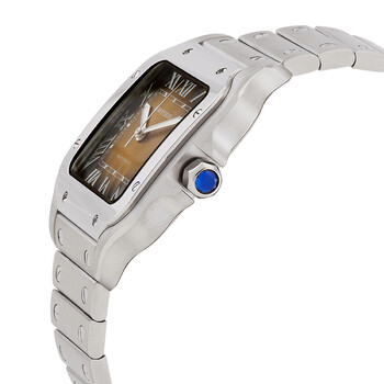Silver-tone stainless steel case and bracelet. Fixed silver-tone stainless steel bezel. Brown dial with silver-tone hands and Roman numeral hour markers. Minute scale around the inner rim. Dial Type: Analog. Luminescent hands and markers. Date display at the 6 o'clock position. Cartier Calibre 1847 automatic movement. Scratch resistant sapphire crystal. Solid case back. Square case shape, case size: 35.1 mm, case thickness: 8.83 mm. Folding clasp. Water resistant at 100 meters / 330 feet. Functions: date, hour, minute, second. Santos De Cartier Series. Luxury watch style. Watch label: Swiss Made. Cartier Santos de Cartier Automatic Brown Dial Ladies Watch WSSA0065.