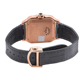 18kt rose gold case with a grey (alligator) leather strap. Fixed 18kt rose gold bezel. Silvered opaline dial with blued-steel sword-shaped hands and black Roman numeral hour markers. Minute markers around the inner ring. Dial Type: Analog. Cartier calibre 1847 MC automatic movement, containing 23 Jewels, bitting at 28800 vph, and has a power reserve of approximately 42 hours. Scratch resistant sapphire crystal. Solid case back. Square case shape. Case size: 35.1 mm. Case thickness: 8.83 mm. Push button clasp. Water resistant at 100 meters / 330 feet. Functions: hour, minute, second. Santos Series. Luxury watch style. Watch label: Swiss Made. Cartier Santos Silvered Opaline Dial Automatic Ladies Watch WGSA0028.