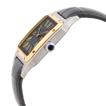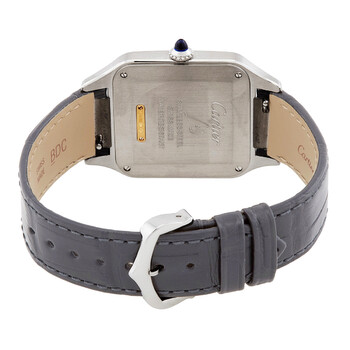 Silver-tone stainless steel case with a gray alligator-skin band. Fixed 18kt yellow gold bezel. Gray dial with gold-tone hands and Roman numeral hour markers. Minute markers around the outer rim. Dial Type: Analog. Quartz movement. Scratch resistant sapphire crystal. Solid case back. Rectangle case shape, case size: 43.5 mm x 31.4 mm, case thickness: 7.3 mm. Ardillon buckle clasp. Water resistant at 30 meters / 100 feet. Functions: hour, minute. Additional Info: beaded crown with a synthetic blue cabochon-shaped spinel. Santos-dumont Series. Luxury watch style. Watch label: Swiss Made. Cartier Santos-Dumont Quartz Gray Dial Unisex Watch W2SA0028.