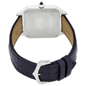Stainless steel case with a blue (alligator) leather strap. Fixed stainless steel bezel. Silver dial with blued-steel sword-shaped hands and black Roman numeral hour markers. Minute markers around the outer rim. Dial Type: Analog. Quartz movement. Scratch resistant sapphire crystal. Cabochon crown. Solid case back. Rectangle case shape. Case dimensions: 43.5 mm x 31.4 mm. Case thickness: 7.3 mm. Fold over clasp. Water resistant at 30 meters / 100 feet. Functions: hour, minute. Additional Info: original box, manual (complete accessories). Santos-dumont Series. Luxury watch style. Watch label: Swiss Made. Cartier Santos-Dumont Quartz Silver Dial Men's Watch WSSA0022.