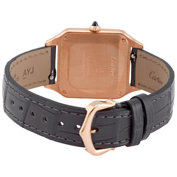 18kt rose gold case with a grey (alligator) leather strap. Fixed 18kt rose gold bezel. Silver dial with blued-steel sword-shaped hands and black Roman numeral hour markers. Minute markers around the outer rim. Dial Type: Analog. Quartz movement. Scratch resistant sapphire crystal. Pull / push crown set with a blue synthetic cabochon-shaped spinel. Solid case back. Square case shape. Case dimensions: 38 mm x 27.5 mm. Case thickness: 7.3 mm. Tang clasp. Water resistant at 30 meters / 100 feet. Functions: hour, minute. Santos-dumont Series. Luxury watch style. Watch label: Swiss Made. Cartier Santos-Dumont Silver Dial 18kt Rose Gold Ladies Watch WGSA0022