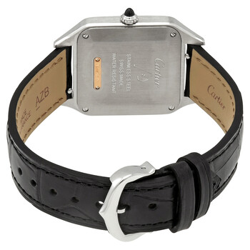 Stainless steel case with a black (alligator) leather strap. Fixed 18kt rose gold bezel. Silver dial with blued-steel sword-shaped hands and black Roman numeral hour markers. Minute markers around the outer rim. Dial Type: Analog. Quartz movement. Scratch resistant sapphire crystal. Screw down crown. Solid case back. Square case shape. Case dimensions: 38 mm x 27.5 mm. Case thickness: 7.3 mm. Tang clasp. Water resistant at 30 meters / 100 feet. Functions: hour, minute, second. Additional Info: original box, manual (complete accessories). Santos-dumont Series. Luxury watch style. Watch label: Swiss Made. Cartier Santos-Dumont Quartz Silver Dial Unisex Watch W2SA0012.