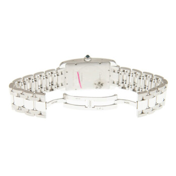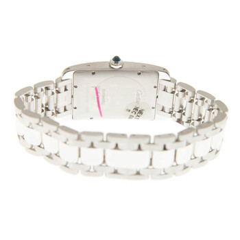 18kt white gold case with a silver-tone 18kt white gold bracelet. Fixed 18kt white gold bezel. White dial with blued-steel sword-shaped hands and black Roman numeral hour markers. Minute scale around the inner rim. Dial Type: Analog. Cartier Calibre 120 Automatic movement, based upon ETA 2000-1, containing 33 Jewels, bitting at 28800 vph, and has a power reserve of approximately 40 hours. Scratch resistant sapphire crystal. Cabochon crown. Solid case back. Rectangle case shape, case size: 28 mm x 45 mm, case thickness: 9 mm. Deployment clasp. Water resistant at 30 meters / 100 feet. Functions: date, hour, minute, second. Tank Americaine Series. Luxury watch style. Watch label: Swiss Made. Cartier Tank Americaine Automatic White Dial Ladies Watch W26055L1.