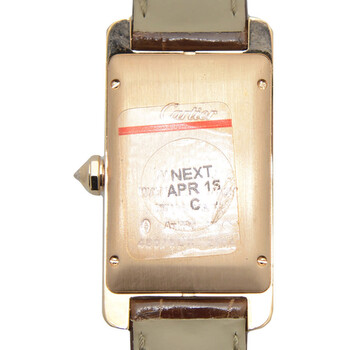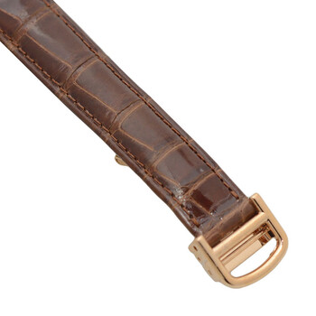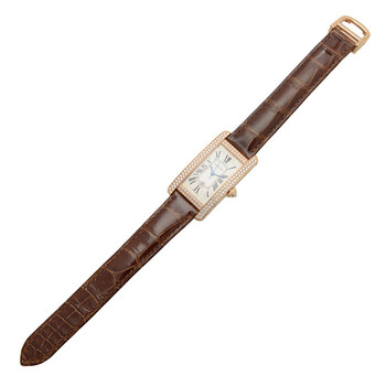 18kt pink gold case with a brown leather strap. Fixed bezel set with diamonds bezel. Silver dial with blue-toned hands and Roman numeral hour markers. Minute markers around the outer rim. Dial Type: Analog. Date display at the 6 o'clock position. Hand Wind movement. Scratch resistant sapphire crystal. Case diameter: 41.6 mm x 22.6 mm. Case thickness: 9.65 mm. Rectangle case shape. Deployment clasp. Water resistant at 30 meters / 100 feet. Functions: date, hour, minute, second. Luxury watch style. Cartier Tank Americaine Silver Dial Brown Leather Unisex Watch WB704751.