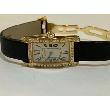 18k pink gold case with a shiny brown alligator leather strap. Fixed set with diamonds bezel. Silver dial with blued steel hands and Roman numeral hour markers. Minute markers around the inner rim. Dial Type: Analog. Date display between 4 and 5 o'clock position. Quartz movement. Scratch resistant sapphire crystal. Case diameter: 34.8 x 19 mm. Rectangle case shape. Buckle clasp. Water resistant at 30 meters / 100 feet. Functions: hour, minute. Luxury watch style. Cartier Tank Americaine Silver Dial 18k Pink Gold Men's Watch WJTA0002.