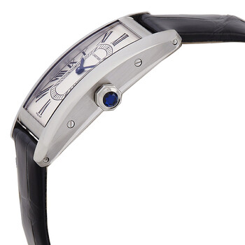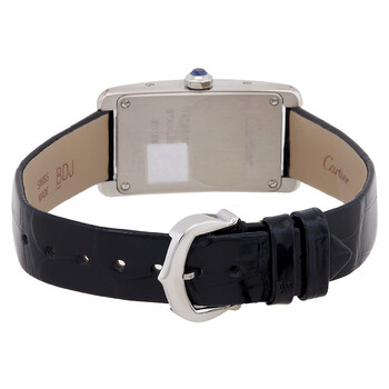 Silver-tone stainless steel case with a black alligator leather strap. Fixed silver-tone stainless steel bezel. Silver dial with blued hands and Arabic numeral hour markers. Dial Type: Analog. Quartz movement. Scratch resistant sapphire crystal. Faceted crown with a faceted synthetic blue spinel crown. Rectangle case shape, case size: 35.4 mm x 19.4 mm, case thickness: 6.8 mm. Buckle clasp. Water resistant at 30 meters / 100 feet. Functions: hour, minute. Tank Americaine Series. Dress watch style. Watch label: Swiss Made. Cartier Tank Americaine Quartz Silver Dial Ladies Watch WSTA0082.