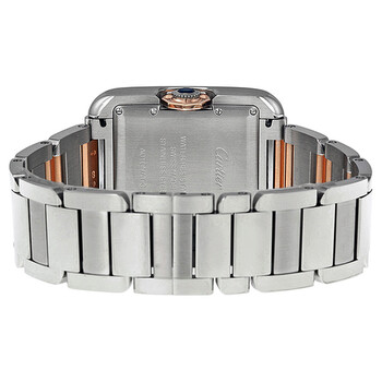 Stainless steel case with a stainless steel bracelet with 18kt rose gold links. Fixed stainless steel bezel. Silver dial with blue hands and Roman numeral hour markers. Minute markers around an inner ring. Dial Type: Analog. Date display at the 3 o'clock position. Cartier calibre 077 automatic movement with a 42-hour power reserve. Scratch resistant sapphire crystal. Pull / push crown. Solid case back. Rectangle case shape. Case dimensions: 39.2 mm x 29.8 mm. Case thickness: 9.5 mm. Band width: 18 mm. Deployment clasp with a push button release. Water resistant at 30 meters / 100 feet. Functions: date, hour, minute, second. Luxury watch style. Watch label: Swiss Made. Cartier Tank Anglaise Large Automatic Rose Gold and Steel Ladies Watch W5310037.