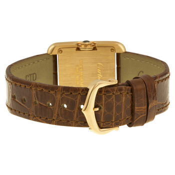18kt rose gold case with a brown leather strap. Fixed 18kt rose gold bezel. Silver dial with blue-toned hands and Roman numeral hour markers. Minute markers around an inner ring. Dial Type: Analog. Quartz movement. Cartier Caliber 057 engine. Scratch resistant sapphire crystal. Pull / push crown. Solid case back. Case diameter: 30 mm x 23 mm. Case thickness: 7.19 mm. Rectangle case shape. Tang clasp. Water resistant at 30 meters / 100 feet. Functions: hour, minute. Dress watch style. Watch label: Swiss Made. Cartier Tank Anglaise Silver Dial 18k Rose Gold Brown Leather Small Ladies Watch W5310027.