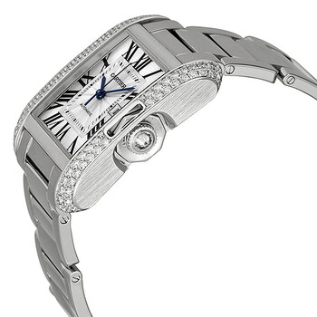 18kt white gold case with a white gold-tone 18kt white gold bracelet. Fixed 18kt white gold diamond set bezel. Silver flinque dial with blued-steel sword-shaped hands and black Roman numeral hour markers. Minute markers around the inner ring. Dial Type: Analog. Date display at the 3 o'clock position. Cartier Calibre 077 automatic movement with a 42-hour power reserve. Scratch resistant sapphire crystal. Pull / push crown. Solid case back. Rectangle case shape, case size: 39.2 mm x 29.8 mm, case thickness: 9.5 mm. Hidden fold over clasp. Water resistant at 30 meters / 100 feet. Functions: date, hour, minute, second. Luxury watch style. Watch label: Swiss Made. Cartier Tank Anglaise Silver Dial 18kt White Gold Diamond Ladies Watch WT100009.
