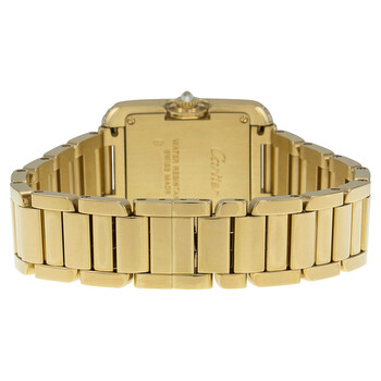 18kt yellow gold case with a 18kt yellow gold bracelet. Fixed set with diamonds bezel. Silver and lacquered flinque dial with blue sword shaped hands and Roman numeral hour markers. Minute markers around the inner rim. Dial Type: Analog. Quartz movement. Scratch resistant sapphire crystal. Case diameter: 30.2 x 22.7 mm. Rectangle case shape. Deployment with push button clasp. Water resistant at 30 meters / 100 feet. Functions: hour, minute. Luxury watch style. Watch label: Swiss Made. Cartier Tank Anglaise Silver dIAL 18kt Yellow Gold Ladies Watch WT100005.