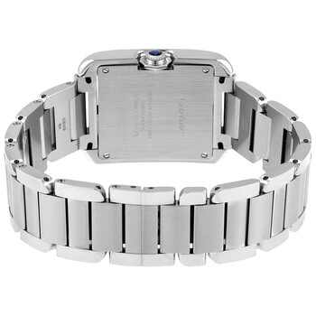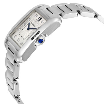 Stainless steel case with a stainless steel bracelet. Fixed stainless steel bezel. Silver dial with blue hands and diamond hour markers. A Roman numeral appears at the 12 o'clock position. Minute markers around an inner ring. Dial Type: Analog. Quartz movement. Scratch resistant sapphire crystal. Pull / push crown. Case dimensions: 39.2 mm x 29.8 mm. Case thickness: 7.1 mm. Rectangle case shape. Brace;let width: 20 mm. Deployment clasp. Water resistant at 30 meters / 100 feet. Functions: hour, minute. Luxury watch style. Watch label: Swiss Made. Cartier Tank Anglaise Silver Dial Diamond Stainless Steel Ladies Watch W4TA0004.