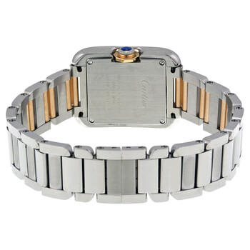 Stainless steel case with a stainless steel bracelet with 18kt rose gold center links. Fixed stainless steel bezel. Silver dial with blue hands and Roman numeral hour markers. Minute markers around an inner ring. Dial Type: Analog. Luminescent hands and markers. Quartz movement. Scratch resistant sapphire crystal. Nine-sided crown set with a synthetic spinel cabochon. Solid case back. Rectangle case shape. Case dimensions: 30.2 mm x 22.7 mm. Case thickness: 7.19 mm. Band width: 20 mm. Deployment with push button release clasp. Water resistant at 30 meters / 100 feet. Functions: hour, minute. Luxury watch style. Watch label: Swiss Made. Item Variations: W5310036. Cartier Tank Anglaise Silver Dial Ladies Watch W5310019.