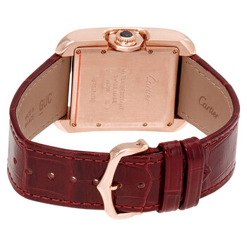 18 carat pink gold case with a bordeaux alligator leather strap. Fixed bezel. Silver dial with blued steel hands and diamonds hour markers. Minute markers around the inner rim. Dial Type: Analog. Automatic movement. Scratch resistant sapphire crystal. Case diameter: 39.2 x 29.8 mm. Case thickness: 9.5 mm. Rectangle case shape. Tang clasp. Water resistant at 30 meters / 100 feet. Functions: hour, minute. Luxury watch style. Watch label: Swiss Made. Cartier Tank Anglaise Silver Dial Ladies Watch WJTA0006.