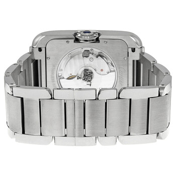Stainless steel case with a stainless steel bracelet. Fixed stainless steel bezel. Silver dial with blue hands and Roman numeral hour markers. Minute markers around an inner ring. Dial Type: Analog. Date display at the 3 o'clock position. Cartier calibre 1904 MC automatic movement with a 48-hour power reserve. Scratch resistant sapphire crystal. Pull / push crown. Skeleton case back. Rectangle case shape. Case dimensions: 47 mm x 36.2 mm. Case thickness: 9.82 mm. Band width: 24 mm. Hidden fold over clasp. Water resistant at 30 meters / 100 feet. Functions: date, hour, minute, second. Luxury watch style. Watch label: Swiss Made. Cartier Tank Anglaise Silver Dial Stainless Steel Men's Watch W5310008.