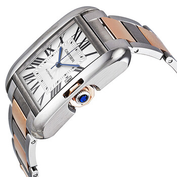Stainless steel case with a stainless steel bracelet wilth 18kt rose gold center links. Fixed stainless steel bezel. Silver dial with blue hands and Roman numeral hour markers. Minute markers around an inner ring. Dial Type: Analog. Date display appears at the 3 o'clock position. Automatic movement with a 48-hour power reserve. Scratch resistant sapphire crystal. Nine-sided crown set with a synthetic spinel cabochon. Skeleton case back. Case dimensions: 47 mm x 36.2 mm. Case thickness: 9.82 mm. Rectangle case shape. Bracelet width: 22 mm. Deployment clasp with a push button release. Water resistant at 30 meters / 100 feet. Functions: date, hour, minute, second. Luxury watch style. Watch label: Swiss Made. Cartier Tank Anglaise XL Automatic Silver Dial 18 kt Rose Gold and Steel Men's Watch W5310006.