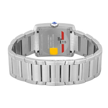 Silver-tone stainless steel case and bracelet. Fixed silver-tone stainless steel bezel. Silver dial with blue hands and Roman numeral hour markers. Minute scale around the inner rim. Dial Type: Analog. Quartz movement. Scratch resistant sapphire crystal. Pull / push crown. Solid case back. Square case shape, case size: 32 x 27 mm, case thickness: 7.1 mm. Water resistant at 30 meters / 100 feet. Functions: hour, minute. Tank Française Series. Watch label: Swiss Made. Cartier Tank Française Medium Model Quartz Silver Dial Ladies Watch WSTA0074.