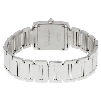 18kt white gold case and bracelet. Fixed 18kt white gold bezel set with 24 diamonds. Silver grained dial with sword-shaped blued steel hands and black Roman numeral hour markers. Minute markers around an inner ring. Quartz movement. Scratch resistant sapphire crystal. 18kt white gold octagonal crown set with a single diamond. Solid case back. Case dimensions: 25 mm x 20 mm. Case thickness: 6 mm. Hidden deployment clasp. Water resistant at 30 meters / 100 feet. Functions: hour and minute. Cartier Tank Francaise 18kt White Gold Diamond Ladies Watch WE1002S3.