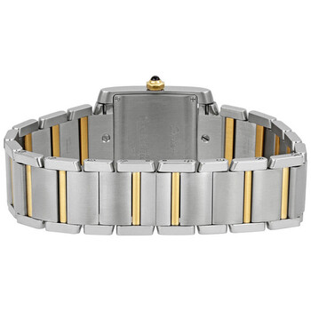 Stainless steel case with a stainless steel bracelet with 18kt yellow gold bars. Fixed stainless steel bezel. Silver grained dial dial with sword-shaped blue hands and black Roman numeral hour markers. Minute markers around the inner ring. Dial Type: Analog. Luminescent hands and dial markers. Date display appears at the 3 o'clock position. Swiss quartz movement. Scratch resistant sapphire crystal. 18kt yellow gold octagonal crown set with a blue faceteted sapphire. Solid case back. Case dimensions: 29 mm x 26 mm. Case thickness: 7 mm. Square case shape. Band width: 17.8 mm. Band length: 7 inches. Hidden deployment clasp. Water resistant at 30 meters / 100 feet. Functions: hours, minutes, calendar. Luxury watch style. Watch label: Swiss Made. Item Variations: W51012Q4, Cartier-W51012Q4. Cartier Tank Francaise 18kt Yellow Gold and Steel Ladies Watch W51012Q4.