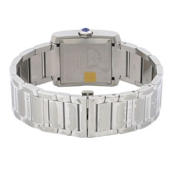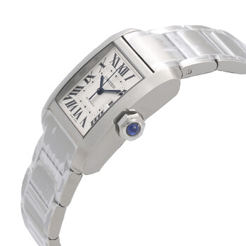 Silver-tone stainless steel case and bracelet. Fixed silver-tone stainless steel bezel. Silver dial with blue hands and Roman numeral hour markers. Minute markers around an inner ring. Dial Type: Analog. Automatic movement. Scratch resistant sapphire crystal. Beaded crown set with a synthetic cabochon-shaped. Solid case back. Rectangle case shape, case size: 36.7 mm x 30.5 mm, case thickness: 10.1 mm. Deployment clasp. Water resistant at 30 meters / 100 feet. Functions: date, hour, minute, second. Tank Francaise Series. Dress watch style. Watch label: Swiss Made. Cartier Tank Francaise Automatic Silver Dial Ladies Watch WSTA0067.