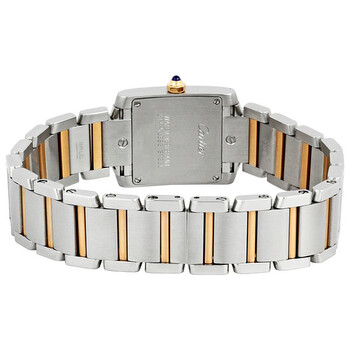 Stainless steel case with a stainless steel bracelet with 18kt rose gold accents. Fixed stainless steel bezel. Pink motherof pearl dial with sword-shaped blued steel hands and black Roman numeral hour markers. Minute markers around an inner ring. Dial Type: Analog. Cartier calibre 057 quartz movement. Scratch resistant sapphire crystal. Push / pull octagonal crown set with a sapphire cabochon. Solid case back. Square case shape. Case size: 20.3 mm. Case thickness: 5.94 mm. Hidden deployment clasp. Water resistant at 30 meters / 100 feet. Functions: hour, minute. Luxury watch style. Watch label: Swiss Made. Item Variations: W51027Q4, Cartier-W51027Q4. Cartier Tank Francaise Pink Mother of Pearl Ladies Watch W51027Q4.