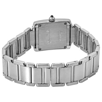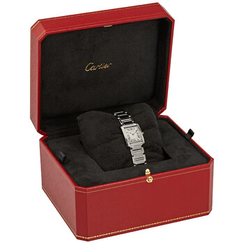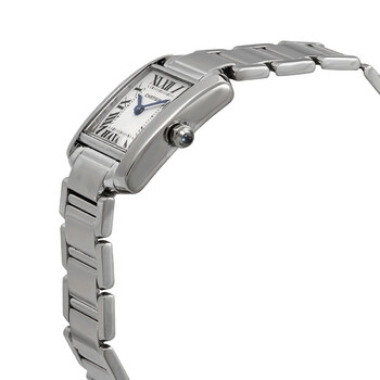 18kt white gold case and bracelet. Fixed 18kt white gold bezel. Silver dial with blued-steel sword-shaped hands and Roman numeral hour markers. Minute markers around aninner ring. Dial Type: Analog. Quartz movement. Scratch resistant sapphire crystal. Pull / push crown set with a sapphire cabochon. Solid case back. Square case shape. Case dimensions: 25 mm x 20 mm. Case thickness: 6 mm. Band length: 6.5 inches. Hidden deployment clasp. Water resistant at 30 meters / 100 feet. Functions: hour, minute. Tank Francaise Series. Luxury watch style. Watch label: Swiss Made. Item Variations: W50012S3, Cartier-W50012S3. Cartier Tank Francaise Silver Dial 18kt White Gold Ladies Watch W50012S3.