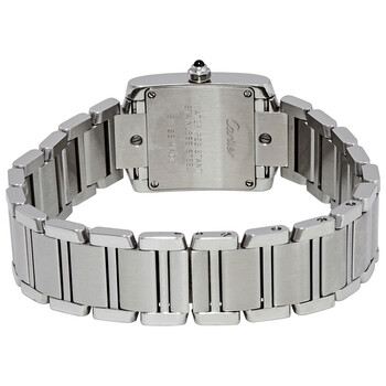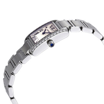Stainless steel case with a stainless steel bracelet. Fixed stainless steel bezel set with 24 diamonds. Silver dial with blue hands and Roman numeral hour markers. Minute markers around an inner ring. Dial Type: Analog. Cartier calibre 1904 2TZ MC quartz movement. Scratch resistant sapphire crystal. Pull / push crown. Solid case back. Square case shape. Case dimensions: 20 mm x 25 mm. Case thickness: 6 mm. Fold over clasp. Water resistant at 30 meters / 100 feet. Functions: hour, minute. Additional Info: bezel set with 24 diamonds (0.49 carats). Luxury watch style. Watch label: Swiss Made. Cartier Tank Francaise Silver Dial Ladies Watch W4TA0008.