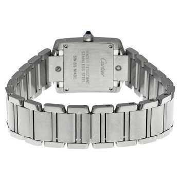 Stainless steel case with a stainless steel bracelet. Fixed stainless steel bezel. Silver grained dial with blue sword-shaped hands and black Roman numeral hour markers. Minute markers around an inner ring. Luminescent hands and dial markers. Battery operated Swiss quartz movement. Scratch resistant sapphire crystal. Steel octagonal crown set with a faceted sapphire. Stainless steel case back. Case dimensions: 20 mm x 25 mm. Case thickness: 6 mm. Hidden deployment clasp. Water resistant at 30 meters / 100 feet. Functions: hours, minutes. Cartier Tank Francaise Steel Ladies Watch W51008Q3.