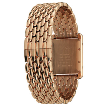 Rose gold-tone 18kt rose gold case and bracelet. Fixed rose gold-tone bezel with diamond set 18kt rose gold. Silver-tone dial with blued-steel sword-shaped hands and Roman numeral hour markers. Minute scale around the inner rim. Dial Type: Analog. Automatic movement. Scratch resistant sapphire crystal. Pull / push crown. Solid case back. Rectangle case shape, case size: 33.7 mm, case thickness: 6.6 mm. Band width: 18 mm. Hidden clasp. Water resistant at 30 meters / 100 feet. Functions: hour, minute. Tank Louis Series. Luxury watch style. Watch label: Swiss Made. Cartier Tank Louis Automatic Diamond Silver Dial Ladies Watch WJTA0021.