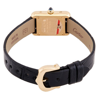 Yellow gold-tone 18kt yellow gold case with a black alligator band. Fixed yellow gold-tone 18kt yellow gold bezel. White dial with blued-steel sword-shaped hands and Roman numeral hour markers. Dial Type: Analog. Quartz movement. Cabochon crown. Rectangle case shape, case size: 24.0 mm x 16.5 mm, case thickness: 6.2 mm. Buckle clasp. Water resistant at 30 meters / 100 feet. Functions: hour, minute. Tank Series. Luxury watch style. Watch label: Swiss Made. Cartier Tank Quartz White Dial Ladies Watch WGTA0212.