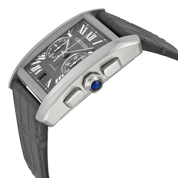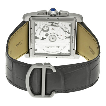 Stainless steel case with a grey (alligator) leather strap. Fixed stainless steel bezel. Grey dial with silver-tone hands and Roman numeral hour markers. Minute markers around the outer rim. Dial Type: Analog. Date display at the 6 o'clock position. Chronograph - two sub-dials displaying: 12 hour and 30 minute. Cartier calibre 1904-CH MC automatic movement with a 48-hour power reserve. Scratch resistant sapphire crystal. Pull / push crown. Transparent sapphire case back. Rectangle case shape. Case dimensions: 34.3 mm 44 mm. Case thickness: 11.7 mm. Deployment clasp. Water resistant at 30 meters / 100 feet. Functions: chronograph, column wheel, date, hour, minute, small second. Luxury watch style. Watch label: Swiss Made. Cartier Tank MC Chronograph Grey Dial Grey Leather Men's Watch W5330008.