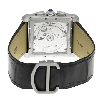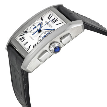 Stainless steel case with a black leather strap. Fixed stainless steel bezel. Silver dial with blue hands and Roman numeral hour markers. Minute markers around the outer rim. Dial Type: Analog. Date display at the 6 o'clock position. Two sub-dials displaying: 12 hour and 30 minute. Cartier calibre 1904-CH MC automatic movement with a 48-hour power reserve. Scratch resistant sapphire crystal. Pull / push crown. Transparent sapphire case back. Case size: 34.3 mm x 44 mm. Case thickness: 11.7 mm. Rectangle case shape. Fold over clasp. Water resistant at 30 meters / 100 feet. Functions: chronograph, column wheel, date, hour, minute, small second. Luxury watch style. Watch label: Swiss Made. Cartier Tank MC Chronograph Silver Dial Men's Watch W5330007.