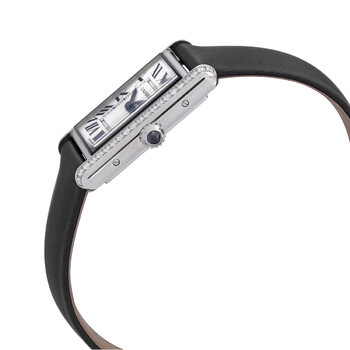 Stainless steel case with a black (calfskin) leather strap. Fixed stainless steel bezel set with 42 brilliant-cut diamonds. Silver dial with blue hands and Roman numeral hour markers. Minute markers around an inner ring. Dial Type: Analog. Quartz movement. Scratch resistant sapphire crystal. Beaded crown set with a synthetic cabochon. Solid case back. Rectangle case shape. Case dimensions: 33.7 mm x 25.5 mm, case thickness: 6.6 mm. Tang clasp. Water resistant at 30 meters / 100 feet. Tank Must Series. Dress watch style. Watch label: Swiss Made. Cartier Tank Must Quartz Diamond Silver Dial Ladies Watch W4TA0017.
