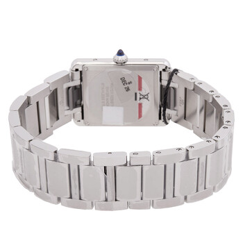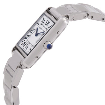 Silver-tone stainless steel case and bracelet. Fixed silver-tone stainless steel bezel. Silver-tone dial with blued-steel sword-shaped hands and Roman numeral hour markers. Minute scale around the inner rim. Dial Type: Analog. Quartz movement. Scratch resistant sapphire crystal. Pull / push crown. Solid case back. Rectangle case shape, case size: 33.7 mm x 25.5 mm, case thickness: 6.6 mm. Band width: 20 mm. Hidden clasp. Water resistant at 30 meters / 100 feet. Functions: hour, minute. Tank Must Series. Luxury watch style. Watch label: Swiss Made. Cartier Tank Must Quartz Silver Dial Ladies Watch WSTA0106.