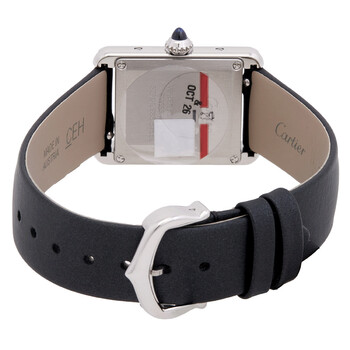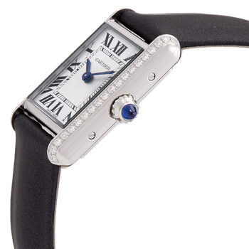 Silver-tone stainless steel case with a black calfskin band. Fixed bezel with diamond set. Silver dial with blue hands and index-Roman numeral hour markers. Quartz movement. Solid case back. Rectangle case shape, case size: 29.5 mm x 22 mm, case thickness: 6.6 mm. Water resistant at 30 meters / 100 feet. Functions: hour, minute. Tank Series. Dress watch style. Watch label: Swiss Made. Cartier Tank Must Small Model Diamond Silver Dial Watch W4TA0031.