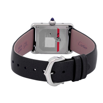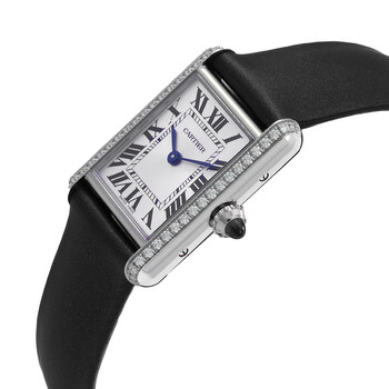 Stainless steel case with a black (calfskin) leather strap. Fixed stainless steel bezel set with diamonds. Silver dial with blued-steel sword-shaped hands and Roman numeral hour markers. Minute markers around an inner ring. Dial Type: Analog. Quartz movement. Scratch resistant sapphire crystal. Pull / push crown set with a single cabochon. Solid case back. Rectangle case shape. Case dimensions: 29.5 mm x 22 mm. Case thickness: 6.6 mm. Tang clasp. Water resistant at 30 meters / 100 feet. Functions: hour, minute. Additional Info: original box, manual (complete accessories). Tank Series. Luxury watch style. Watch label: Swiss Made. Cartier Tank Quartz Diamond Silver Dial Ladies Watch W4TA0016.