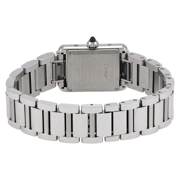 Stainless steel case with a stainless steel bracelet. Fixed stainless steel bezel. Silver dial with blued-steel sword-shaped hands and Roman numeral hour markers. Minute markers around an inner ring. Dial Type: Analog. Quartz movement. Scratch resistant sapphire crystal. Screw down crown. Solid case back. Rectangle case shape. Case dimensions: 29.5 mm x 22 mm. Case thickness: 6.6 mm. Fold over clasp. Water resistant at 30 meters / 100 feet. Functions: hour, minute. Additional Info: original box, manual (complete accessories). Tank Series. Luxury watch style. Watch label: Swiss Made. Cartier Tank Quartz Silver Dial Ladies Watch WSTA0051.