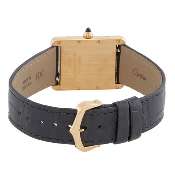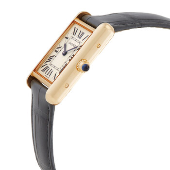 18kt yellow gold case with a grey (alligator) leather strap. Fixed 18kt yellow gold bezel. Silver dial with blued-steel sword-shaped hands and Roman numeral hour markers. Minute markers around an inner ring. Dial Type: Analog. Quartz movement. Scratch resistant sapphire crystal. Pull / push crown set with a blue cabochon. Rectangle case shape. Case dimensions: 33.7 mm x 25.5 mm. Case thickness: 6.3 mm. Tang clasp. Water resistant at 30 meters / 100 feet. Functions: hour, minute. Tank Series. Casual watch style. Watch label: Swiss Made. Cartier Tank Quartz Silver Dial Men's Watch WGTA0067.