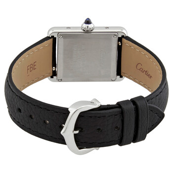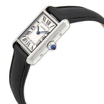 Stainless steel case with a black leather strap. Fixed stainless steel bezel. White dial with blued-steel sword-shaped hands and Roman numeral hour markers. Minute markers around an inner ring. Dial Type: Analog. Quartz movement. Scratch resistant sapphire crystal. Push / pull crown with a blue cabochon. Solid case back. Rectangle case shape. Case dimensions: 29.5 mm x 22 mm. Case thickness: 6.6 mm. Tang clasp. Water resistant at 30 meters / 100 feet. Functions: hour, minute. Additional Info: original box, manual (complete accessories). Tank Series. Luxury watch style. Watch label: Swiss Made. Cartier Tank Quartz White Dial Ladies Watch WSTA0042.