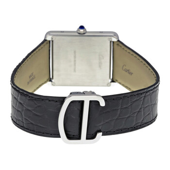 Stainless steel case with a black leather strap. Fixed stainless steel bezel. Silver dial with blued steel hands and black Roman numeral hour markers. Minute markers around an inner ring. Quartz movement. Scratch resistant mineral crystal. Steel grained crown set with a spinal cabochon. Solid case back. Case dimensions: 27 mm x 34.5 mm. Case thickness: 8 mm. Deployment clasp. Water resistant at 30 meters / 100 feet. Functions: hours, minutes. Cartier Tank Solo Steel Large Men's Watch W5200003.