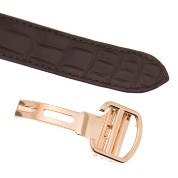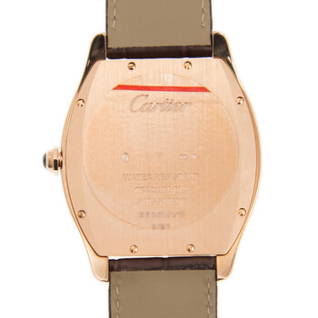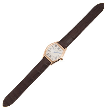 18k pink gold case with a brown alligator leather strap. Fixed bezel. Silver dial with blue-tone hands and Roman numeral hour markers. Minute markers around the outer rim. Dial Type: Analog. Hand wind movement. Scratch resistant sapphire crystal. Pull / push crown. Case diameter: 44.95 mm x 36.1 mm. Case thickness: 9.4 mm. Tonneau case shape. Water resistant at 30 meters / 100 feet. Functions: hour, minute. Luxury watch style. Watch label: Swiss Made. Cartier Tortue Silver Dial 18K Pink Gold Men's Large Watch WGTO0002.