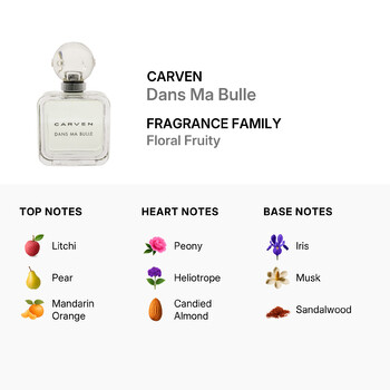 Belonging to the Floral Fruity family, Dans Ma Bulle opens with bright and juicy top notes of litchi, pear, and mandarin orange. These fresh and lively aromas instantly lift your mood and draw you into a dreamy escape. At the heart, soft peony and heliotrope blend beautifully with the sweet warmth of candied almond, creating a delicate yet memorable bouquet that feels both romantic and youthful.