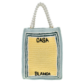 Casablanca Ladies Tote. SKU: APS24BAG09401-MULTI. Barcode: 5056626896218. Color: Multicolor. Casablanca Crochet Tote Bag With Embroidered Logo. This crochet tote bag features an embroidered logo, a rectangular body, two faux pearl top handles, striped detailing, and an embroidered logo on the front of the main compartment. It has an open top with front and back compartments. 100% Cotton.