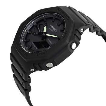 Black carbon/resin case with a black resin strap. Fixed carbon/resin bezel. Black dial with black hands and index hour markers. Minute markers around the outer rim. Dial Type: Analog-digital. Full auto-calendar (to year 2099). Quartz movement. Scratch resistant mineral crystal. Solid case back. Round case shape, case size: 48.5 × 45.4 mm, case thickness: 11.8 mm. Tang clasp. Water resistant at 200 meters / 660 feet. Functions: date, day, hour, minute, second, world time (31 time zones), countdown timer, 5 daily alarm, month, stopwatch,. Sport watch style. Watch label: Japan Movt. Casio Alarm World Time Quartz Analog-Digital Black Dial Men's Watch GA2100-1A1.