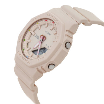 Beige resin case and strap. Fixed beige resin bezel. Beige/digital dial with luminous beige hands and index hour markers. Minute scale around the inner rim. Dial Type: Analog-digital. Luminescent led. Full auto-calendar (to year 2099). Quartz movement. Scratch resistant mineral crystal. Screw down crown. Solid case back. Octogonal case shape, case size: 46 × 40.2 × 11.2 mm. Buckle clasp. Water resistant at 200 meters / 660 feet. Functions: hour, minute, second,world time,1/100-second stopwatch,12/24-hour format,5 daily alarms,hourly time signal. Sport watch style. Watch label: Japan Movt. Casio Alarm World Time Quartz Analog-Digital Ladies Watch GMAP2100IT-4A.