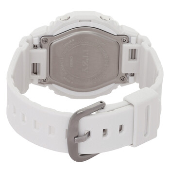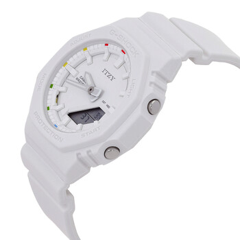 White resin case and strap. Fixed white resin bezel. White dial with luminous silver-tone hands and index hour markers. Minute scale around the inner rim. Dial Type: Analog-digital. Luminescent led. Full auto-calendar (to year 2099). Quartz movement. Scratch resistant mineral crystal. Screw down crown. Solid case back. Octogonal case shape, case size: 46 × 40.2 × 11.2 mm. Buckle clasp. Water resistant at 200 meters / 660 feet. Functions: hour, minute, second,world time,1/100-second stopwatch,12/24-hour format,5 daily alarms,hourly time signal. Sport watch style. Watch label: Japan Movt. Casio Alarm World Time Quartz Analog-Digital White Dial Ladies Watch GMAP2100IT-7A.