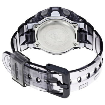 Grey transparent resin case with a grey transparent resin strap. Fixed grey resin bezel. Blue digital dial. Hours, minutes, seconds, date and day of the week. Dial Type: digital. Full-auto calendar. Casio Calibre 3252 quartz movement. Scratch resistant mineral crystal. Solid case back. Round case shape, case size: 42.6 mm, case thickness: 15.4 mm. Band width: 20 mm. Tang clasp. Water resistant at 200 meters / 660 feet. Functions: hour, minute, second, el backlight (afterglow), world time (29 timezones), day counter, 5 daily alarms, hourly time signal, stopwatch, countdown timer, 12/24 hour formats. Sport watch style. Casio Grey Transparent Resin Ladies Watch BG169R-8B.